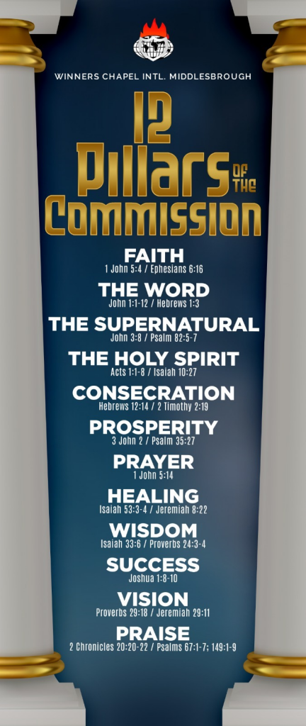 He has named these 12 areas of emphasis as the 12 Pillars of our Commission. We have crossed Jordan into power, bearing the ark of liberation.
